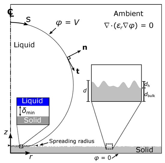 for both the ambient phase and the dielectric material. We note that Equation (6) is not solved inside the droplet since a conductive liquid is considered. In the performed computations, the permittivity, , is assumed to be given by a continuous function of this form, , where is a function that descripes the solid topography. This expression ensures a continuous transition between the solid-ambient interface, i.e., the permittivity of the ambient phase and the dielectric material. In particular, the permittivity, , becomes equal to in the ambient phase (insulating medium) whereas it equals to for the solid dielectric, respectively. In addition, when the parameter attains a high value, a sharp transition between the two regions is achieved. For the simulations in this work, it is assumed that = 500. Equation (6) is solved accounting for the following boundary conditions: , imposed at the liquid-ambient interface, where, V, is the voltage applied between the base electrode and the conductive droplet and, , applied at the bottom of the solid dielectric (base electrode) (see also Figure 1).