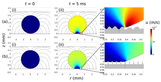 Visualization of the velocity magnitude (at t = 0 and t = 5 ms) of a glycerin droplet on two different structured solid dielectrics: (a) arbitrary-structured and (b) stripe-structured ( = 114°, = 20 μm and d = 50 μm for both solid dielectric cases). The electric field lines are also depicted (a voltage of 220 V, or = 0.25, is applied in both cases). As observed in the inset, a Wenzel state is observed at the arbitrary-structured topography (a) whereas a Cassie-Baxter state is accommodated in stripe-structured topography (b). The disjoining pressure parameters we use are, according our previous work (see [14,15,16]): = 12, = 10, = 9 × 10−3 and = 8 × 10−3 (resulting in = 1.25 μm) while the dimensionless slip parameter: = 103.