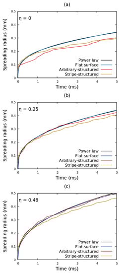 To further investigate the effect of solid geometry on electrospreading dynamics, in Figure 4 we present the temporal evolution of the contact radius of a glycerin droplet, spreading under the effect of electric field, for a flat, an arbitrary-structured and a stripe-structured solid topography (the surface topographies are presented in Figure 2). Starting with the case where no voltage is applied (Figure 4a) we observe that the spreading dynamics are highly influenced by the solid geometry, especially for t > 2 ms. In particular, the spreading radius on the structured dielectrics deviates (i.e., moves slower) from the one of the flat substrate. The fluctuations observed in the spreading radius are attributed to the non smooth advancing of the liquid interface front over the solid surface protrusions of the structured surfaces. It is interesting, though, that the spreading curves approach each other by increasing the applied voltage ( = 0.25 to 0.48 in Figure 4b,c). Essentially, the electrostatic force highly accelerates the droplet advancing front, nearly annihilating the influence of the substrate topography. We have calculated the relative strength, , defined as the ratio of the electrostatic pressure term, , over the disjoining pressure, , in the vicinity of the three-phase contact line [12]. Results show that as the electrowetting number increases the relative strength of the electrostatic pressure term also increases. In particular, for 0.25, 0.48 and 0.75 the becomes 0.23, 0.52 and 1.11 respectively (for d = 50 m). This indicates that the electric field becomes the dominant factor in electrospreading dynamics as the applied voltage is increased.