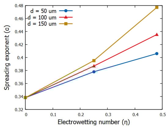 Since the electric field strongly affects the spreading dynamics, its distribution, which in turn governs the electric stress distribution, at the liquid interface should strongly affect the dynamics, too. We have recently found that both the field distribution and the liquid interfacial tension shape at the three-phase contact line, is substantially affected by the dielectric thickness, especially for thick dielectrics as a result of fringe field contributions (see [11,12,13]). Here we study how dielectric thickness affects electrospreading. In particular, in Figure 5 we have evaluated the spreading exponent of the power-law, as fitted on the corresponding results obtained by simulations, for flat and smooth solid substrates of thickness d = 50, 100 and 150 m. Previous studies have reported that the power-law exponent increases as the Young’s contact angle decreases [4]. Such an argument is also observed in our simulations since the exponent increases by increasing the electrowetting number (the contact angle decreases due to electrowetting action). Surprisingly enough, we also observe that the power-law exponent depends on the thickness of the solid dielectric. In particular, it considerably increases with the dielectric thickness. This behavior gets even more pronounced for higher applied voltages.