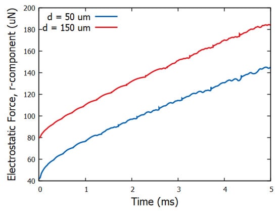 Effective electrostatic force in the radial direction, , induced by the different electric field distributions for the thin (d = 50 m) and the thick (d = 150 m) dielectric cases ( = 0.48).