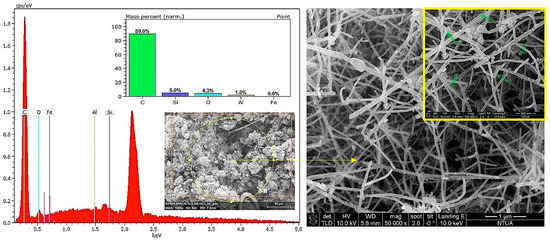 SEM images of the produced carbon nanofibers (CNFs) in (50,000× and 100,000× magnification) and an Energy Dispersive X-Ray Spectroscopy (EDS) analysis of CNFs for the purification assessment.