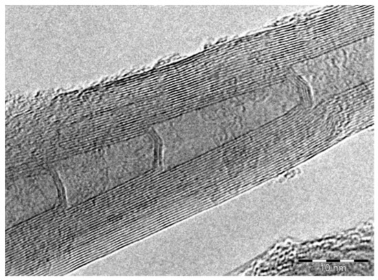 After their synthesis, CNFs were purified to remove any amorphous by-product remaining, which could be observed as spherical agglomerates in a fluffy form. Moreover, the purification enabled the removal of the metallic catalyst residues. In order to purify the sample, a step-by-step chemical procedure took place. Initially, the sample was stirred in NaOH (1 mol/L) for 2 h at 80 °C to remove the Al2O3 substrate. Afterward, the dried sample was extracted with 5 mol/L of HCl overnight in a Soxhlet extractor at the boiling point of the acid. Washing took place with distilled water extensively, in order to remove the dissolved catalyst. The success of the purification was confirmed with Energy Dispersive X-Ray Spectroscopy (EDS) analysis, the results of which are presented below (Figure 1). As can be seen, Fe has been totally removed (0.0 wt.%), while Al from the Al2O3 substrate is up to 1.8 wt.%. The 5 wt.% Si refers to the Si wafer substrate, where the CNFs’ growth took place. In Figure 1, the morphology of the purified CNFs is also presented, which was studied through Scanning Electron Microscopy (SEM). The CNFs produced form entangled bundles with straight structures of less than 5 μm. Their surface is smooth and their diameters are 50 ± 5 μm. Figure 2 presents the CNFs’ internal structure, which has been studied through Transmission Electron Microscopy (TEM). The interconnections of the inner sidewalls are clearly visible. Their internal cavity is also able to be observed and these nanofibers are classified as being stacked-cup.