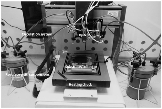 The suspensions were obtained using 10mg of oxidized CNFs in 500 mL of de-ionized water. Centrifugation was performed for 20 min, in two phases, at 3000 rpm. The top parts of the suspensions that were centrifuged was removed. This step is important in order to avoid the utilization of the bundles of high thickness; a critical parameter for the final fabrication of the memories. Indeed, the increased roughness can create dendrites (aligned metal particles linking the two electrodes) and, therefore, can lead to the short-circuiting of the device. The parts of the suspensions that were removed were further diluted in 500 mL of de-ionized water and sonicated in a bath for 6 h. Afterward, the deposition of a 2″ silicon-based substrate, that was preliminarily metalized using a Ti/Pt layer, was performed. The equipment used to spray the suspensions has been developed at Thales Research and Technology, using a patented process [12], and it constitutes the first prototype of this type of machine. This technique has already been implemented for other applications, such as gas sensing [13,14,15,16] and energy storage [17,18,19]. A picture of the machine set-up is shown in Figure 3 [18,20]. To perform the spray, the nozzle can move in two directions (x and y, see Figure 3), while the z-direction is set-up at the beginning. Due to this, samples with dimensions of 15 cm × 15 cm can be sprayed. The substrate is positioned on a heated chuck that can reach 250 °C. The temperature adjustment is an important parameter; in order to avoid the “coffee ring effect”, the drops reaching the substrate are heated at the boiling point of the solvent, which is 100 °C in this case, with water. Due to this, the nanomaterials in the drops are stuck in the impact zone and cannot move to the borders of the drop, achieving a uniform deposition.