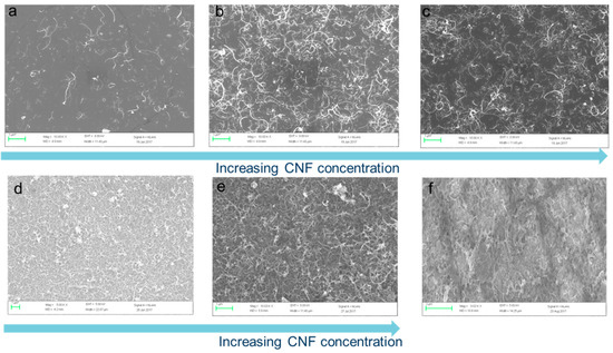SEM images of carbon nanofibers (CNFs) deposited with the spray technique. The coverage rate increases until full coverage is reached in Figure 5e (single nozzle) and 5f (double nozzle). The concentration of the CNFs is increased due to the deposition time (a) 3 μm−1 (b) 6 μm−1 (c) 10 μm−1 (d) 15 μm−1 (e) 30 μm−1 (f) 60 μm−1 (the number corresponds to the CNFs, but an error of around 20% must be taken into account).