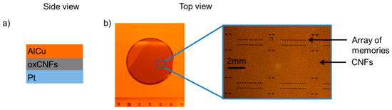 On top of the deposited CNFs layer, we patterned 100 μm × 100 μm squares where we then deposited AlCu/Au contacts. The active memory stack is depicted in Figure 5: