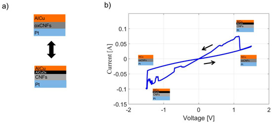 (a) The schematic side view of the two states of resistance of the memory stack (b) An image of a cycle obtained by applying a voltage between the inert Pt electrode and the AlCu electrode. The hysteretic change of current results from the migration of oxygen atoms between the carbon nanofiber (CNF) layer and the AlCu metal.