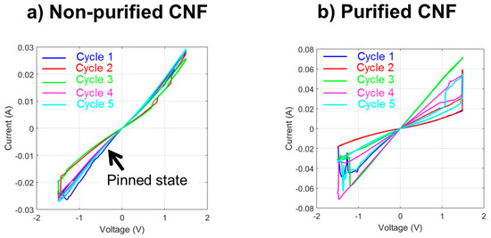 One must note that the purity of the CNFs is essential to obtain this kind of behavior. In the case of non-purified CNFs, pinning of the memory has been observed, meaning that after a few cycles, the memory stays stuck in one state. This issue has been overcome by using purified CNFs, in which the memory stands show typical hysteresis cycles without being trapped in one state, as depicted in Figure 7. The tests showed that the memory behavior was retained throughout the 100 cycles.