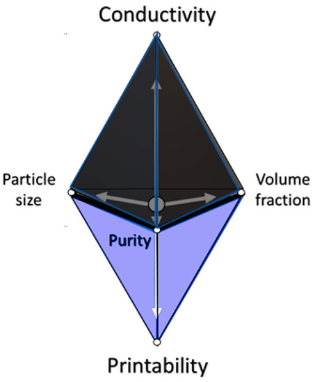 Graphical representation of the general relationship of the conductivity trade-off with printability, in terms of tailoring conductive inks. The variables in the base triangle increase (particle size (μm), volume fraction (%), and purity (%)) the conductivity increases. Conversely, the printability increases with decreases in these variables.