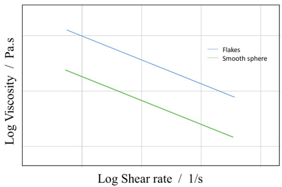 General relationship of viscosity and shear rate, for flake suspension versus smooth sphere suspension (Sketch representation of the general trend concluded from Ran Niu et al. [19]).