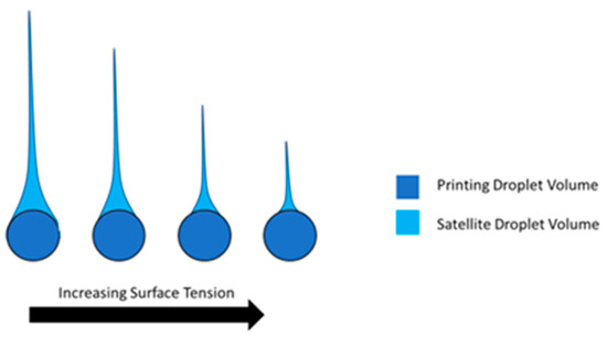 Surface tension is an important property for the additive manufacturing printing process, as it can affect the printability and formation on the substrate. Higher surface tension shrinks more rapidly and has a far shorter tail, which leads to fewer satellite droplets. Higher surface tension in the nozzle obtains higher printability and resolution with fewer defects from satellite drops. Leakage and liquid accumulation at the nozzle are also problems associated with low surface tension, or viscosity for that matter [13,14]. The effects of surface tension on ink droplet formation are depicted in Figure 5.