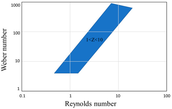where η and σ are the dynamic viscosity and surface tension of the fluid, respectively [22]. This value is normally utilized as its inverse Z = 1/Oh, where 1 < Z < 10 are the limits to stable drop formation [23]. This idealized region for printability is seen in Figure 6.
