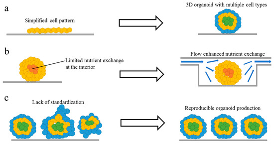 Limitations and goal of current organoid models. (a) Traditional in vitro models are too simplified, complex organoid models with multiple cell types and 3D architecture can be developed to better recapitulate in vivo organs. (b) There is a lack of nutrient exchange at the interior of the organoid, introducing flow and improving nutrient and gas exchange will help to create larger and more mature organoids. (c) Current organoid technology has limited uniformity and reproducibility, with better geometrical confinement and environmental control, future organoids production will be more reproducible.