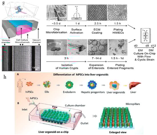 The intestine organoid culture models derived from Lgr5+ intestinal stem cells are usually embedded within Matrigel [3]. They can be propagated indefinitely under growth factor treatment. The organoid model recapitulates the heterogeneity of the intestinal epithelial layer and is suitable for in situ imaging of intestinal development. However, the presence of an enclosed organoid lumen is non-physiological, since secreted biochemical and waste products concentrate within the central lumen instead of being transported through peristalsis and luminal flow. Moreover, as mentioned in the previous section, organoid cultures lack tissue-tissue interfaces, mechanical stimuli, and interaction with other cell types such as immune cells. To this end, Kasendra et al. developed a more complex and physiologically relevant microfluidic intestinal culture system using human cells derived from organoids generated from biopsies of the human intestine [62]. This microfluidic chip enables 3D intestinal villi-like structures to be formed in situ. This chip contains two culture channels: an epithelial channel and a vascular channel. They are separated by a thin (50 μm) flexible ECM-coated porous PDMS membrane containing 7 μm diameter pores (Figure 2g). The epithelial and vascular channels are flanked on either side by two hollow vacuum chambers that permit application of cyclic suction to mechanically stretch and relax the microchannels to emulate the peristaltic motions of a living human small intestine. The epithelial cells cultured on the chip exhibited multi-lineage differentiation, established epithelial barrier function, and produced mucus. The transcriptome analysis of the cells cultured on the intestine chip more closely resembled that of adult human duodenum in vivo than the original organoids that were used to generate the cells to seed in the chips. The study exemplifies an improvement from past in vitro intestine microfluidic models [63,64] by incorporating primary cells isolated from patient-specific biopsy-derived organoids as well as gut microvascular endothelial cells. The model supports the formation of villus-like structures without the need to use a micropatterned villus-shaped flexible scaffold.