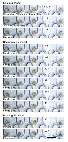 - Wielhouwer, E.M.; Ali, S.; Al-Afandi, A.; Blom, M.T.; Olde Riekerink, M.B.; Poelma, C.; Westerweel, J.; Oonk, J.; Vrouwe, E.X.; Buesink, W.; et al. Zebrafish embryo development in a microfluidic flow-through system. Lab Chip 2011, 11, 1815–1824. [Google Scholar] [CrossRef] [PubMed]