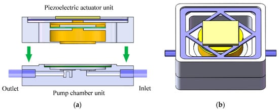 16] and used the vibration inertia of the vibrator to drive the movement of the diaphragm in the pump chamber. In 2015, the University of Science and Technology of China also designed a piezoelectric resonance pump with double pump chamber units [