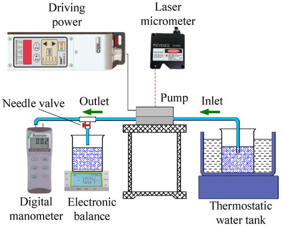 Experimental prototypes were made for the performance tests. The amplitude–frequency characteristics of the pump vibration system were studied without water pumping. To begin with, we set the peak-to-peak voltage of the driving power as 220 V. Then we changed the driving frequency and measured the amplitude of the square piezoelectric vibrator and the pump chamber diaphragm by laser micrometer. The test results are shown in