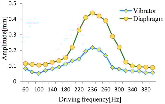 Figure 9; as the driving frequency increased, the amplitudes of the vibrator and the diaphragm both initially increased, but then declined. When the driving frequency was 236 Hz, the amplitudes of the vibrator and the diaphragm reached the maximum values of 0.21808 mm and 0.43933 mm, respectively. At this point, the system resonated.