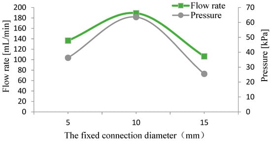 Figure 10. The results showed that the piezoelectric resonance pump had the best output performance when the fixed connection diameter was 10 mm, with a flow rate of 189 mL/min and an output pressure of 63 kPa at this point.
