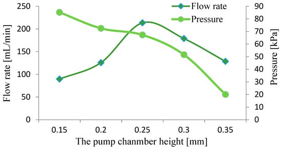 Figure 11. Comparing the trends between curves in the chart, it can be seen that the flow rate of the resonance pump first increased and then fell with the increase of the pump chamber height. When the height was 0.25 mm, the pump’s flow rate reached a maximum of 213.5 mL/min. Conversely, the output pressure of the resonance pump decreased as the chamber height increased, achieving the maximum of 85.2 kPa with a height of 0.15 mm. Increasing the chamber height meant lowering the liquid compression ratio in the pump chamber, and thus the output pressure was reduced.