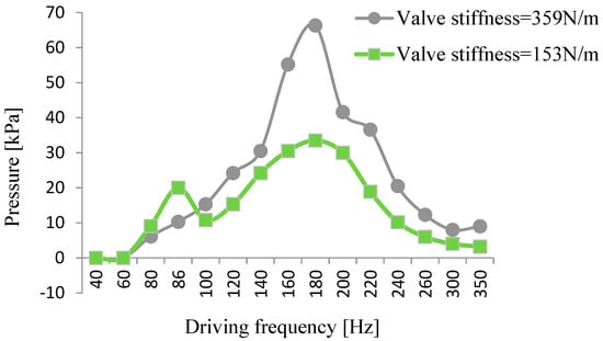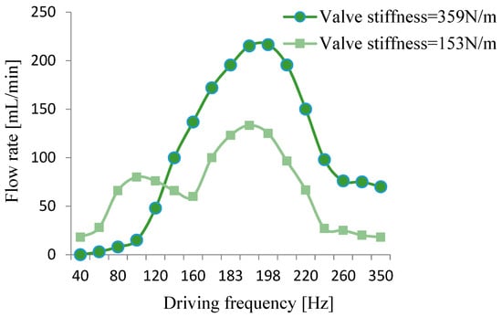 Figure 13. For the prototype with the valve stiffness of 153 N/m, the output flow rate and output pressure changed with the driving frequency. Two peaks were formed, one near the optimal working frequency of the wheeled check valve and the other near the resonance frequency of the pump. For the other prototype of 359 N/m, the flow rate and output pressure also changed with the driving frequency, but only one peak appeared near the pump’s resonance frequency. The above tests show that selecting a wheeled check valve with appropriate stiffness can improve the output performance of the piezoelectric resonance pump.