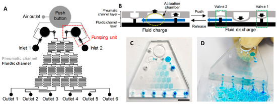 The finger-actuated concentration gradient generator is designed to generate six concentrations with a linear gradient from two reagents (Figure 1A). Two reagents are simultaneously injected into the microfluidic networks to generate a linear concentration gradient by two finger-actuated pumping units operated by a single push button. The reagents from each inlet are mixed effectively by flowing through the mixing channels, before being dispensed from the outlet. Before operating the device, the air outlet is blocked with an acrylic block after pushing the push button to make a negative pressure in the pneumatic channel. As shown in Figure 1B, two pneumatic valves and an actuation chamber comprise the finger-actuated pumping unit and the operation of finger-actuated pumping unit is based on the deflection of the thin poly(dimethylsiloxane) (PDMS) membrane. The PDMS membrane at the pneumatic valve 1 and the actuation chamber are actuated by the pressure change at the pneumatic channel. However, since the pneumatic valve 2 is not connected to the push button by the pneumatic channel, it is actuated according to the pressure change at the fluidic channel. When the button is pushed, increased pressure in a pneumatic channel deflects the PDMS membrane that closes the valve 1 and compresses the actuation chamber. Then, the fluid in an actuation chamber is dispensed into the outlet by opening the pneumatic valve 2. Conversely, the fluid is charged into the actuation chamber when the button is released. The pneumatic valve 2 is closed due to the decreased pressure in a fluidic channel since the pneumatic valve 1 is opened and the actuation chamber is decompressed. Consequently, the fluid can be repeatedly charged and discharged without backflow by pushing and releasing the button. After loading the reagents into each inlet, the device is operated by pushing the button as needed by the end-user. Two fluids are simultaneously injected into the microfluidic networks and six fluids that have different concentration gradients are dispensed into the outlet. The amount of fluid loaded into the inlet can be modified to the needs of the end users, depending on the desired total volume dispensed from the outlet, but the volume dispensed after every single actuation is consistent. However, since the actuation chambers meter the accurate amount of fluid injected into the microfluidic networks, no micropipette is required to inject the correct amount of fluid into the inlet. The volume of the actuation chamber is designed to be 3 μL, so that each time the device is actuated, 1 μL of fluid is dispensed into each outlet. The position of each outlet is designed to be compatible with 96-well microplate and the Tygon tubes are connected to the outlet to facilitate the reagents loading into the microplate. As shown in Figure 1C,D, the desirable volume of fluids having a linear concentration gradient can be simultaneously loaded into the 96-well microplate.