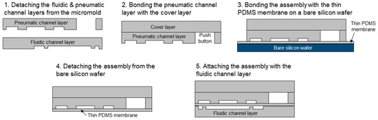 The finger-actuated microfluidic concentration gradient generator consists of three PDMS layers (thickness = 3 mm) and one thin PDMS membrane layer (thickness = 25 μm) (Figure 2). The three PDMS layers were obtained by pouring a mixture of PDMS precursors and a curing agent (PDMS:curing agent = 10:1) onto an SU-8 mold fabricated through photolithography. The PDMS mixture was baked at 85 °C for 60 min and then peeled off. The SU-8 mold was obtained by two-step lithography to make a gap between the weir structure of pneumatic valves and the thin PDMS membrane, which can prevent the weir structure of pneumatic valve from bonding to the thin PDMS membrane. First, SU-8 2005 (MicroChem Corp., MA, USA) was spin-coated onto a silicon wafer (thickness = 5 μm), and then SU-8 2100 was spin-coated (thickness = 95 μm) to obtain a thickness of 100 μm. The thin PDMS membrane layer was obtained by spin-coating the mixture of PDMS onto a bare silicon wafer at a speed of 1500 rpm for 60 s and then baked at 150 °C for 10 min. The bonding of the layers and the membrane was attained through oxygen plasma treatment of 1 min and incubation in an oven at 65 °C for 10 min. The top two PDMS layers were first assembled, then the joined layers were bonded with the PDMS membrane attached to the bare silicon wafer. After peeling off the assembly from the bare silicon wafer, it was then finally bonded with the bottom PDMS layer through oxygen plasma treatment. To fabricate the device to be compatible with a commonly used 96-well microplate, a thin Tygon tube was cut into 6 pieces (length = 1.5 cm) and each inserted into the outlet of the device for the dispensed solution to reach into the well.