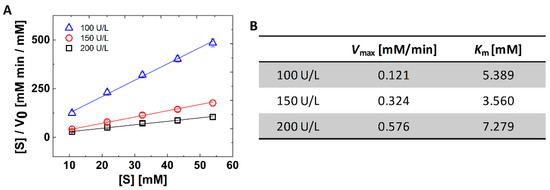 where [S] is the concentration of pNPP, v0 is the initial reaction rate, Vmax is the maximum velocity of ALP, and Km is the Michaelis constant. In the Hanes–Woolf plot, the reciprocal of slope means Vmax and the intercept with y axis means Km over Vmax. Therefore, we calculated the Vmax and Km value with respect to the concentration of ALP (Figure 5B). The calculated Km value shows the agreement with the other studies under the same order [21,22].