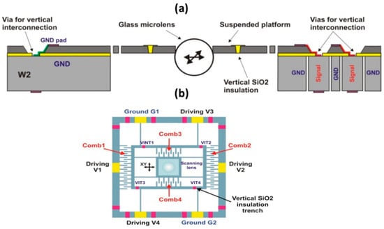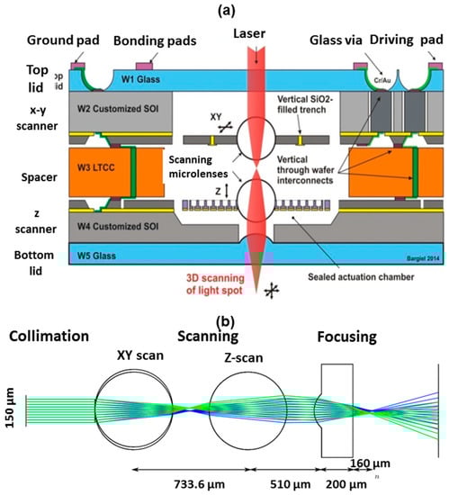 - Baranski, M.; Bargiel, S.; Passilly, N.; Gorecki, C.; Chenping, J.; Frömel, J.; Wiemer, M. Micro-optical design of a three-dimensional microlens scanner for vertically integrated micro-opto-electro-mechanical systems. Appl. Opt. 2015, 54, 6924–6934. [Google Scholar] [CrossRef] [PubMed]