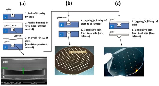 - Albero, J.; Perrin, S.; Bargiel, S.; Passilly, N.; Baranski, M.; Gauthier-Manuel, L.; Bernard, F.; Lullin, J.; Froehly, L.; Krauter, J.; et al. Dense arrays of millimeter-sized glass lenses fabricated at wafer-level. Opt. Express 2015, 23, 11702–11712. [Google Scholar] [CrossRef] [PubMed]