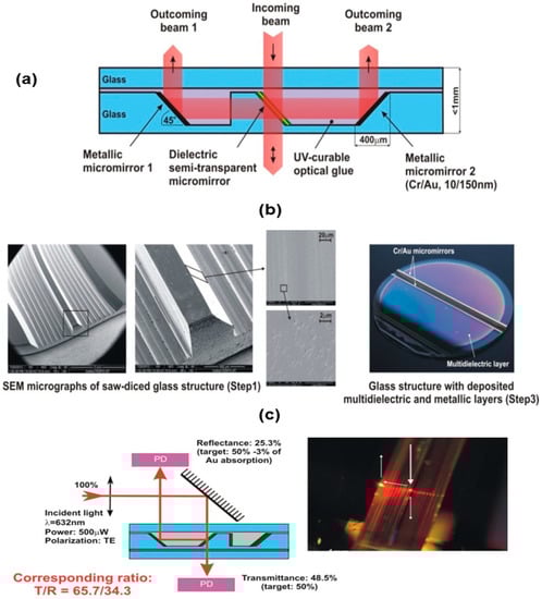 - Baranski, M.; Bargiel, S.; Passilly, N.; Guichardaz, B.; Herth, E.; Gorecki, C.; Jia, C.; Frömel, J.; Wiemer, M. Wafer-level fabrication of microcube-typed beam-splitters by saw-dicing of glass substrates. IEEE Photonics Technol. Lett. 2014, 26, 100–103. [Google Scholar] [CrossRef]