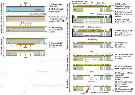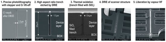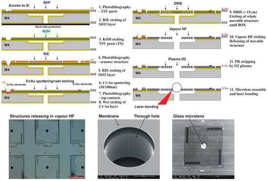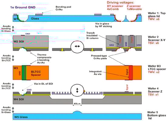 - Wiemer, M.; Wuensch, D.; Frömel, J.; Gessner, T.; Bargiel, S.; Baranski, M.; Passilly, N. Multi-wafer bonding, stacking and interconnecting of integrated 3-D MEMS micro scanners. In Proceedings of the 14th International Symposium in Microwave and Optical Technology, Kuala Lumpur, Malaysia, 28–31 October 2013; p. 28. [Google Scholar]