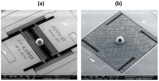 - Laszczyk, K.; Bargiel, S.; Gorecki, C.; Krężel, J.; Dziuban, P.; Kujawinska, M.; Callet, D.; Frank, S. A two directional electrostatic comb-drive X–Y micro-stage for MOEMS applications. Sens. Actuators A 2010, 163, 255–265. [Google Scholar] [CrossRef]