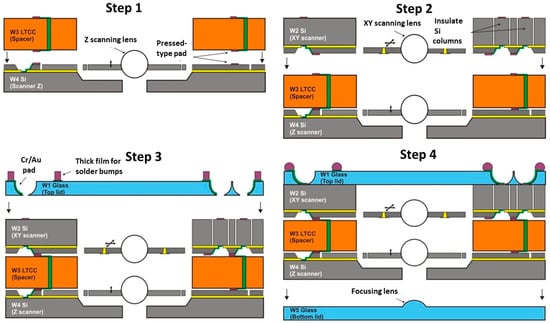 - Bargiel, S.; Gorecki, C.; Baranski, M.; Passilly, N.; Wiemer, M.; Jia, C.; Frömel, J. 3D micro-optical lens scanner made by multi-wafer bonding technology. Proc. SPIE 2013, 8616, 861605. [Google Scholar]
