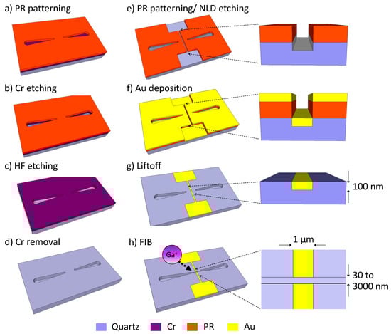 Fabrication of the measurement chip. (a) Photoresist (PR) patterning in preparation for the microchannel. (b) Etching of the Cr layer to create an etching mask to form the microchannel. (c) Hydrofluoric acid (HF) etching of quartz using the Cr layer as an etching mask. (d) Stripping of the Cr layer. (e) Patterning of the second photoresist followed by dry etching to create trenches for the electrode lines. (f) Deposition of the measurement electrode Ti/Au layers. (g) Stripping the photoresist layer to create the completely embedded Ti/Au electrode lines. (h) Simultaneous fabrication of the nanochannel and nanogap electrodes by focused ion beam (FIB) etching.
