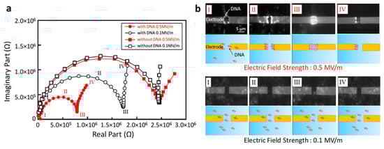 Figure 3a shows a typical Nyquist plot obtained from electrical impedance spectroscopy of 10 kbp DNA with a contour length of 3.4 µm approximately equal to the electrode gap of 3 µm. The impedance of a solution containing only 1 µM SYBR Gold (denoted as “without DNA”) exhibits almost the same responses at applied electric field strengths of 0.1 and 0.5 MV/m, whereas the DNA solution (denoted as “with DNA”) shows different responses. We subsequently compared the electrical impedance values obtained at electric field strengths of 0.1 and 0.5 MV/m with the visual observations of the behavior of the DNA. The numbers from I to IV in the Nyquist plot correspond to the images of the motion and conformation of the DNA shown in Figure 3b. Because the glass cover plate was floating over the electrode (Figure 1d), DNA in the vicinity of the electrode gap was attracted to or repelled by the electrode via electrostatic force during impedance measurements. Hence, the number of DNA molecules in the measurement area was not constant, resulting in measurements that were less quantitatively precise. Nonetheless, the results are sufficiently clear to allow us to distinguish the effect of the high intensity electric field by examining the motion and conformation of the DNA.