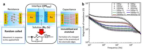 Figure 4b shows the results of fitting the impedance responses of DNA with lengths of 100, 500, 1 k, 5 k, 10 k, and 48.5 kbp at a concentration of 119 ng/mL. The impedance responses were obtained with a 500 nm electrode gap at an electric field strength of 0.5 MV/m with an applied voltage of 0.4 V. The components of the equivalent circuit, Rs, Cs, and CPEDNA, were extracted by a complex nonlinear least squares method using a commercially-available software package (ZView, Solartron Analytical). The reconstructed equivalent circuit values obtained with the appropriate Rs, Cs, and CPEDNA are plotted as solid lines in Figure 4b. All of these plots are in good agreement with the measured impedance responses obtained with varying lengths of DNA. Therefore, this model should be universally applicable to the evaluation of the impedance responses of DNA solutions, and is therefore used for quantitative evaluation purposes hereafter.