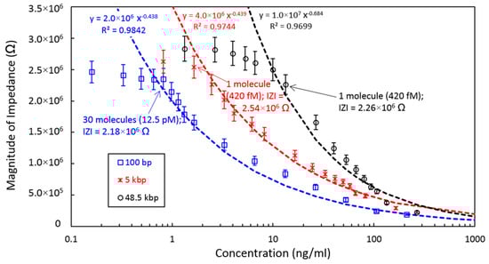 Electrical impedance values as functions of DNA concentration, based on measurements of 100 bp, 5 kbp, and 48.5 kbp DNA in a 800 nm electrode gap with an applied electric field strength of 0.5 MV/m.