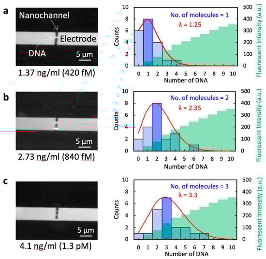 In order to further investigate the single-molecule measurement of DNA, we attempted to visualize the behavior of DNA during the impedance measurement. The DNA was observed using fluorescence in conjunction with the PDMS-covered device, even though it did not allow the acquisition of DNA images as precise as those obtained with the glass cover. No DNA was present outside the electrode gap in these trials, so that only the DNA in the electrode gap was attracted to the electrode edges during the impedance measurements. The images in the left-side column in Figure 6 show the fluorescent microscopy of single, double, and triple 5 kbp DNA molecules at concentrations 420 fM, 840 fM, and 1.3 pM, respectively. These images correspond to the red plot (5 kbp DNA) in Figure 5. The plots in the right-side column show the distribution histograms obtained from 20 visualizations, fitted to Poisson distributions. These plots demonstrate that the number of DNA molecules observed is in good agreement with a Poisson process, meaning that the quantity of DNA will reflect the molar concentration. The green plot in each case represents the measured fluorescent intensity of each length of DNA. Each length is clearly distinguishable by its intensity, and the intensity values are almost linearly proportional to the length of the DNA.