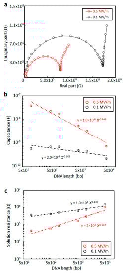 Figure 7 shows the CPEDNA and Rs values obtained from the measured impedance of DNA using the electrical circuit model shown in Figure 4a. Figure 7a presents typical Nyquist plots for the measured impedance of 10 kbp DNA at low (0.1 MV/m) and high (0.5 MV/m) electric field strengths with a 500 nm electrode gap. In this work, various lengths of DNA (100, 500, 1k, 5 k, 10 k, and 48.5 kbp) were investigated at the same concentration of 119 ng/mL, following which the CPEDNA and Rs values were generated from the raw data using the equivalent circuit model. Figure 7b,c plot CPEDNA and Rs at electric field strengths of 0.1 and 0.5 MV/m. The gradients at the higher electric field strength are steeper in the case of both capacitance and resistance. The CPEDNA value at 0.1 MV/m is slightly decreased with increasing DNA length, whereas the CPEDNA measured at 0.5 MV/m decreases more rapidly, corresponding to a sensitivity approximately 9.7 times greater than that at 0.1 MV/m. Likewise, the Rs value gradually increases with increasing DNA length at the electric field strength of 0.1 MV/m, but rises more rapidly at 0.5 MV/m, such that the sensitivity is about 5.8 times greater. It is clear that electrical impedance measurements at high electric field strengths (>0.5 MV/m) allow greater sensitivity in the case of both capacitance and resistance.