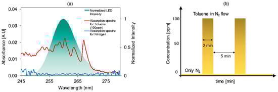 (a) Absorption spectra of toluene (100 ppm), background gas, i.e., nitrogen, and emission spectrum of deep UV-LED. (b) Schematics of flushing routine of nitrogen and toluene for measuring reference and measured intensity respectively.