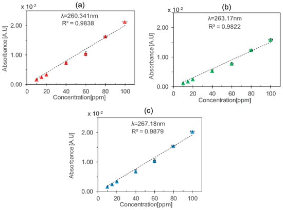 Absorbance vs. toluene concentration using the aluminium HCW at different wavelengths: (a) λ1 = 260.34 nm, (b) λ2 = 263.17 nm, and (c) λ3 = 267.18 nm. The vertical and the horizontal error bars represent standard deviations in absorbance values and combined uncertainties in the generated concentrations defined by the uncertainties of MFCs and gas cylinders, respectively.