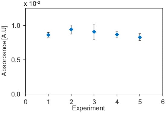 Absorbance for different experimental conditions for repeatability and reproducibility. (1) flowrate, 40 mL/min; (2) flowrate, 20 mL/min; (3) flowrate, 10 mL/min; (4) Detector integration time, 50 ms; and (5) LED current input, 15 mA.