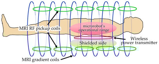 Wireless power transfer (WPT) plays a key role in developing instruments that rely on external powering such as electric vehicles [1], micro-devices [2], and biomedical implants [3,4]. Over the past decade, new designs for coil structures have expanded the usage of WPT in various applications. Early wireless powering structures were based on the resonant coupling of aligned coils [5] and geometry optimization of the power transmitter (Tx) and receiver (Rx) coils [6]. Such structures generate intense magnetic fields over the surrounding space and are able to cause electromagnetic (EM) interference with nearby electric equipment [7,8]. In addition to non-thermal effects [9], an unintentional EM leakage can critically threaten several biomedical procedures such as electric pacemakers [10], magnetic drug targeting [11,12], and magnetic innervation [13]. In addition, several recent techniques for microrobot technology rely on WPT coils in combination with magnetic resonance imaging (MRI) coils for real-time feedback on the function and location of the microrobot [14,15,16,17,18]. However, the magnetic actuators responsible for wireless powering to microrobots often consist of pairs of Maxwell and Helmholtz coils that can easily affect the signal-to-noise ratio in the MRI’s radio-frequency pickup coils [19,20,21]. A single-sided WPT actuator that only affects the microrobot’s operation region and reduces the interference with the magnetic field of the MRI’s pickup coils can be a solution to this challenge (see Figure 1).