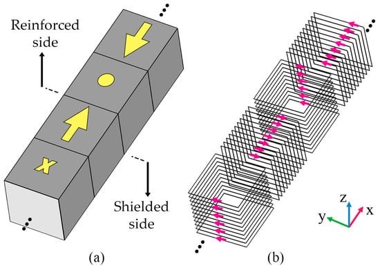Halbach arrays allow magnetic flow to be formed only on one side and weakens the magnetic field’s intensity on the opposing side. Generally, a coil-based scheme can substitute for a linear array of permanent magnets by considering the magnetization vector of each element and ensuring that the new coils generate a magnetic potential similar to the magnets. Based on the Halbach arrays, a one-dimensional (1D) coil scheme was introduced [34] (see Figure 2b), though it is ineligible for miniaturized wireless charging pads due to its bulky and difficult-to-fabricate structure. It also generates cross-polarized magnetic fields whose magnetic energy cannot be harvested even by a well-aligned Rx coil.