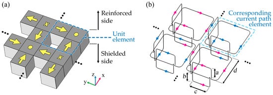 To reduce the cross-polarized fields and lower the overall weight of the Tx, the conventional linear Halbach chain was generalized to a planar two-dimensional (2D) array by adding perpendicular current paths. The schematic of the current in the unit element is shown in Figure 3, where the adjacent elements run currents in opposite directions. The magnetic near field of the path element running a current of I (phasor notation) is derived by [35]: