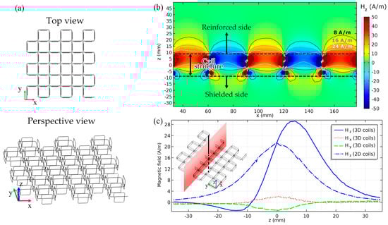 The entire array scheme was modeled using the software COMSOL and the resultant spatial pattern of magnetic fields on a typical y-plane is shown in Figure 4b. It was observed that although no shielding material was employed, the main lobes of the magnetic fields take place only above the structure and play the role for power transfer. Meanwhile, the minor back lobes made by the lateral coils are unable to form an intense magnetic field or transfer power to nearby electric facilities under the Tx coils. Figure 4c compares the proposed single-sided magnetic pattern with the traditional planar 2D coils (i.e., the same structure without the lateral coils).