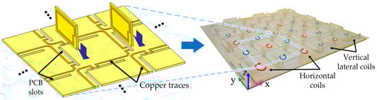 In practice, the horizontal 2D structure was fabricated on a printed circuit board (PCB). Long narrow openings were incised in the horizontal PCB to form the vertical coils’ intersections. The vertical coils were printed on small circuit boards and slotted into the incisions. The connections were fixed and assembled by soldering the lateral and horizontal coils. The vertical coils were fixed by glue. All loops were serially connected and fed by a single power supply. The fabricated structure consisted of an array of 3 × 3 elements in x and y directions and its effective powering area was 144 cm2 (see Figure 5).