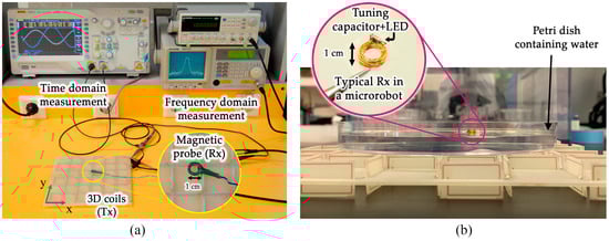 (a) The setup for measuring spatial patterns of the magnetic near-field at various distances from the transmitter (Tx) coil (gridded spacers not shown) at 1000 kHz. The magnetic probe had a similar structure to the microrobot’s power receiver coil. (b) The typical placement of a microrobot’s receiver (Rx) coil swimming on water. It is supplied by the single-sided power transmitter.