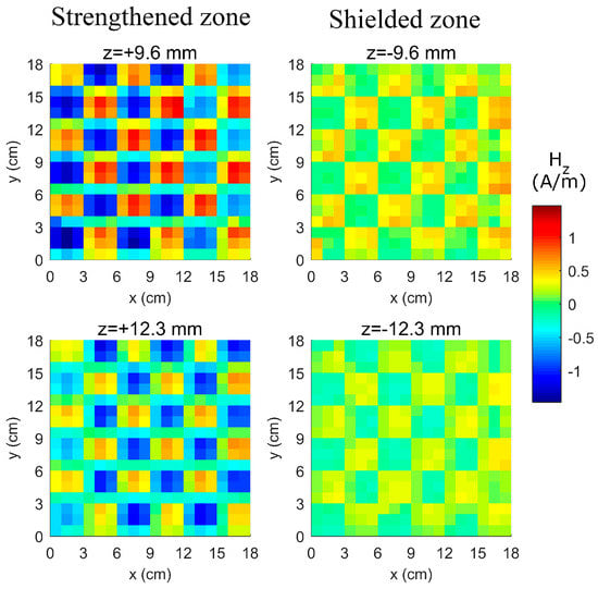 The absolute efficiency of WPT in the strengthened side highly depends on the design of on the Rx structure and may not yield information about shielding. However, to evaluate the shielding function, the magnetic field’s intensity was measured at different distances from the coil array to calculate the relative WPT efficiency above and below the proposed 3D coil array.